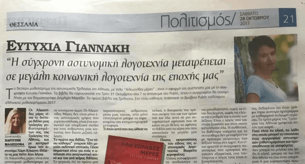 Συνέντευξη στον Λάζαρο Αντωνιάδη Η Ευτυχία Γιαννάκη παρότι νέα συγγραφέας κατάφερε να διακριθεί στον ετήσιο διαγωνισμό βραβείων Public με το πρώτο της βιβλίο της σειράς για την Αθήνα “Στο πίσω κάθισμα” αποσπώντας το βραβείο καλύτερου μυθιστορήματος με 140.000 ψήφους. Η συνέχεια φαίνεται να ελκύει, αφού το δεύτερο μέρος ήδη κυκλοφόρησε και τιτλοφορείται “Αλκυονίδες μέρες” από …